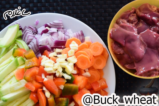 سبزیجات شسته شده و خرد میشوند . جگر پس از شسته شدن به تکه های کوچک بریده میشوند .