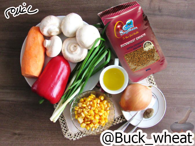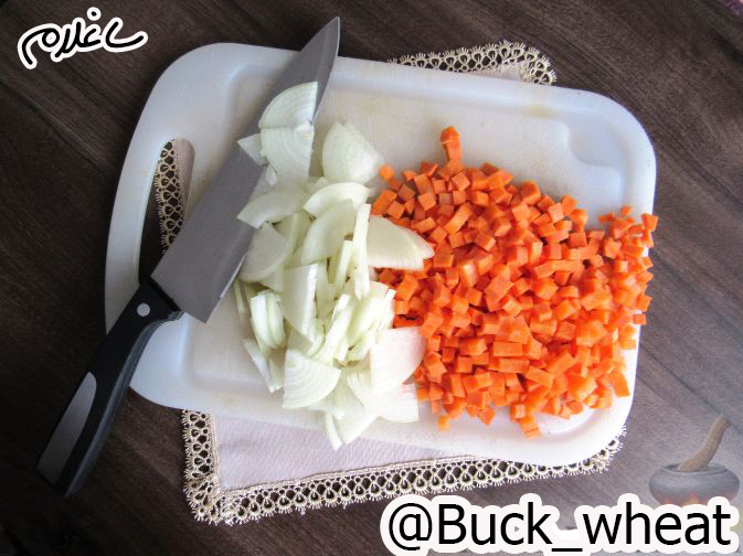 1- گندم سیاه را داخل ظرف بهمراه 3 لیوان آب ، تا جوشیدن آب حرارت داده بعد شعله اجاق راخاموش می کنیم ، سپس درب ظرف را گذاشته تا کشیده شدن آب آن توسط گندم سیاه استراحت میدهیم . ( این عمل باعت میشود تمام ویتامینهای موجود درگندم سیاه داخل آن باقی مانده و از بین نروند ) . سپس هویج و پیاز به قطعات متوسط خرد میشوند.