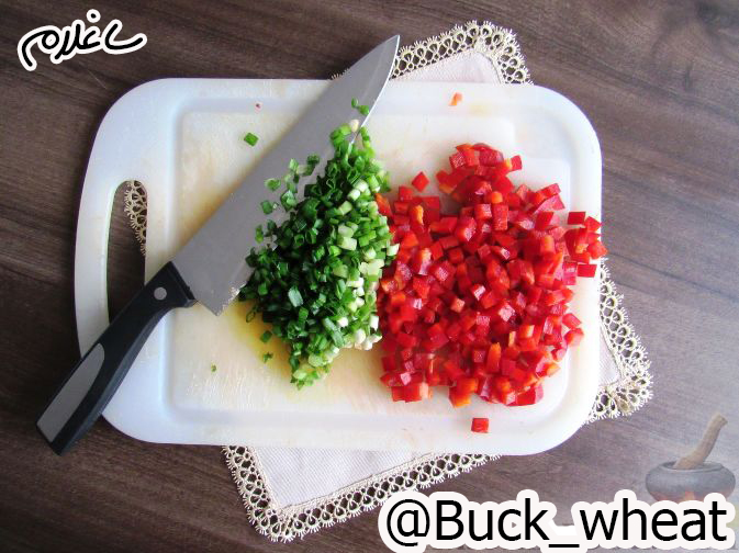 3- فلفل دلمه ای و پیازچه ها به قطعات کوچک خرد میشوند .