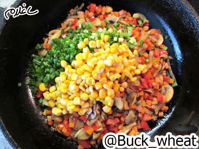 4- ابتدا داخل ظرف ، پیاز ، هویج و قارچ خرد شده را به همراه نصف روغن مورد نیاز تفت داده ، روی آن فلفل دلمه ای را علاوه کرده یک دقیقه دیگر تفت میدهیم بطوری که فلفل دلمه ای ها باید به حالت نیم پز باشند ، سپس شعله اجاق را خاموش کرده ، داخل ظرف کنسرو ذرت ، پیازچه خرد شده و مابقی روغن زیتون را به آن علاوه کرده محتویات ظرف را به آرامی مخلوط میکنیم .