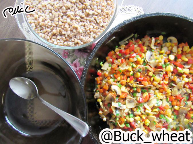 5- محتویات ظرف ، با گندم سیاه پخته شده ، بهمراه نمک و فلفل سیاه مخلوط میشوند .